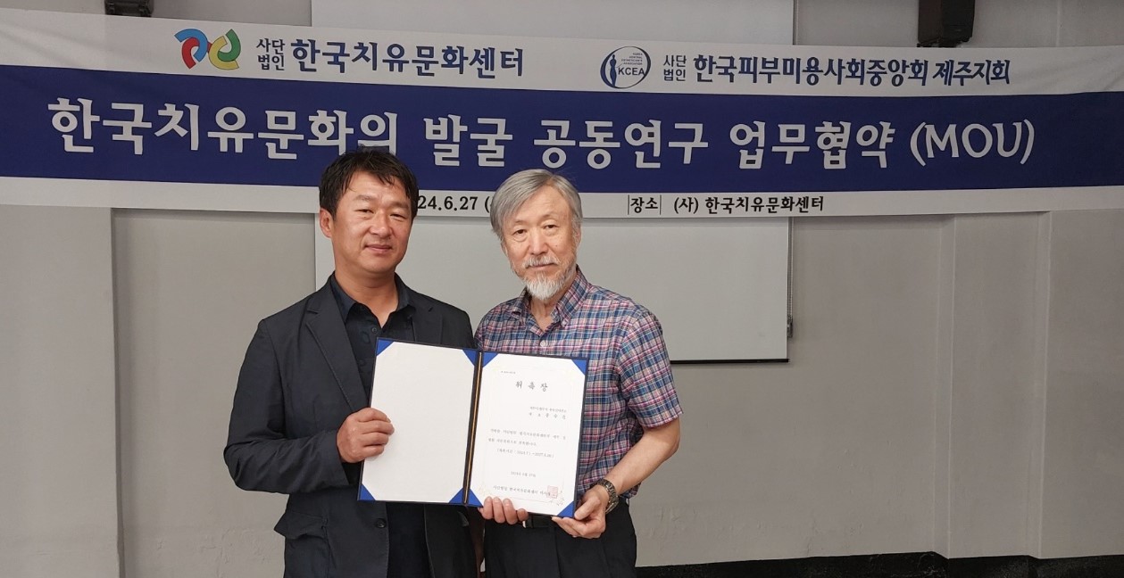 사단법인 한국치유문화센터(이사장 이선주)와 한국피부미용사회중앙회 제주지회(지회장 한형정)는 지난달 27일 제주시 서광로에 위치한 센터 사무실에서 업무협약식을 갖고 치유문화의 발굴과 전문인력 양성을 위한 사업에 나섰다.